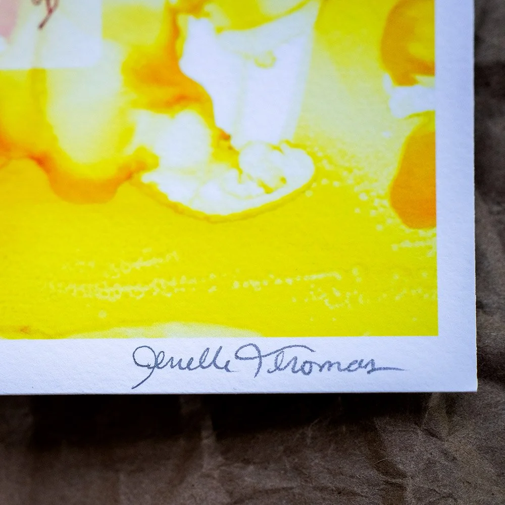 This print is a full-on ode to the warmth of long rides and longer shadows. Sun was hand-carved and paired with vivid textures from alcohol inks burned onto glass, then scanned and layered into a glowing, summer-infused image. Though its printed on fine art paper, it comes from rescued scraps, salvaged materials, and second chances —because even castoffs can radiate.